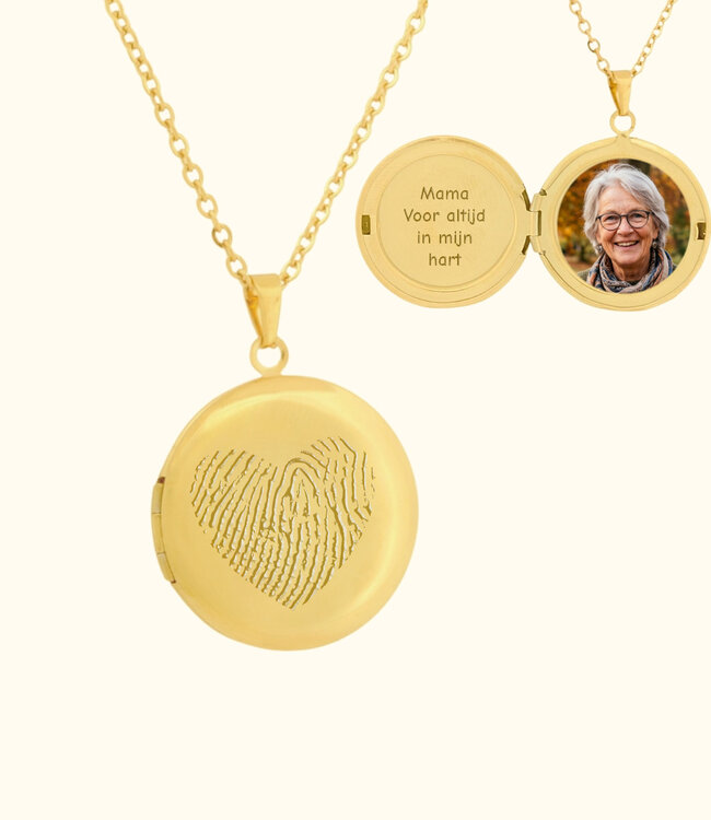 Dit sieraad is een klassiek medaillon dat open kan. Aan de voorkant staat een hartvormige vingerafdruk. Deze staat symbool voor liefde, verbondenheid en herinnering. Binnenin kan een afbeelding en tekst geplaatst worden.