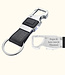 De Sleutelhanger is verkrijgbaar in een zilverkleurige metalen uitvoering met zwarte leren accenten tijdloos, sterk en elegant.